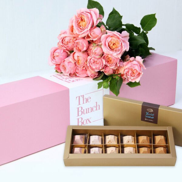 • 5 Stems of Spray Rose in a box with mix chocolates from Xocolatl
