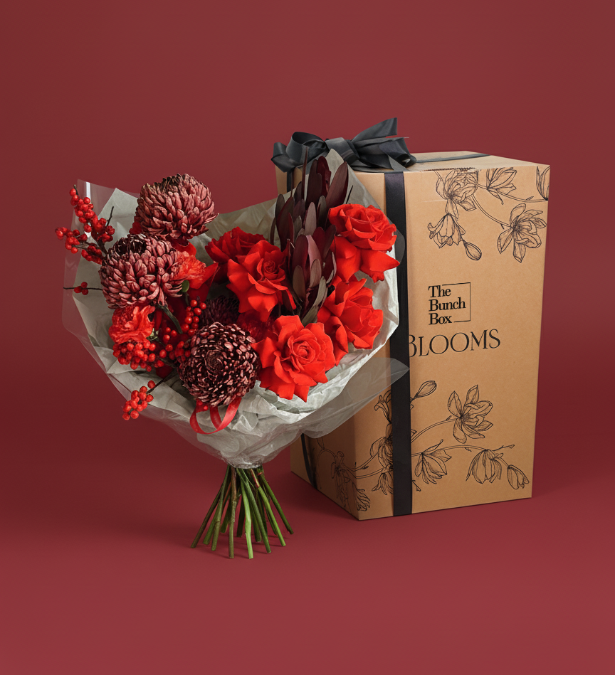 Luxury Finishing: Hand-tied with 2 layers of delicate red ribbon and presented alongside The Bunch Box Blooms signature illustrated gift box.