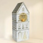 Light-Up Lantern Tin: A tall, townhouse-inspired metal tin adorned with intricate window illustrations, festive garlands, and classic winter detailing.
