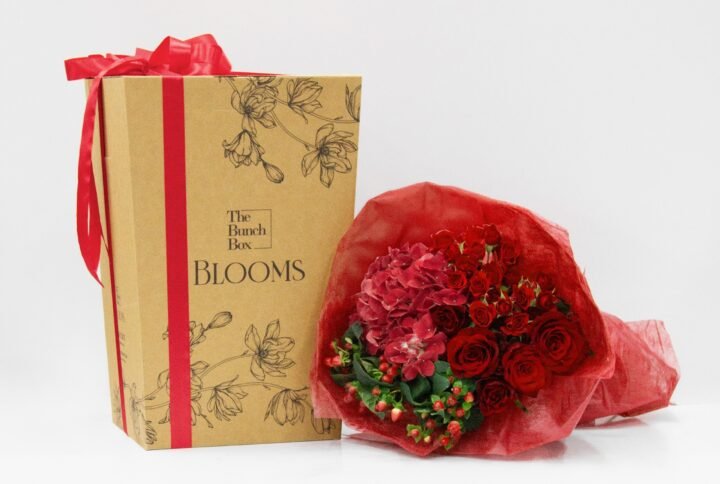 5NOS.SPRAY ROSE DINARA, 5NOSSPRAY ROSE MIRABEL, 5NOS HYPERICUM RED,1 NOS HYDRANGEA MAGICAL TROPHY, BLACK WRAPPING, RIBBON BLACK