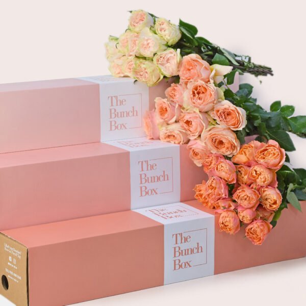 Immerse yourself in the breathtaking beauty of our “Sienna Mixed Bunch” from The Bunch Box, a truly opulent collection designed to evoke romance, warmth, and abundant charm. This exquisite arrangement artfully combines multiple varieties of roses in a symphony of soft, inviting shades, creating a lush and captivating display. It features a generous blend of 10 elegant stems of Wedding Roses, with their delicate, often paler peach tones; 10 luxurious stems of Peach Roses, offering classic, full-bodied blooms in warm peach; and 5 charming stems of Spray Roses, providing multiple smaller blooms for added texture and volume, often in a complementary soft orange hue. The image beautifully showcases the varying shades of peach and orange roses, creating a rich and harmonious gradient. Each stem is a classic 50 cm long, ensuring an impressive and well-proportioned presentation.