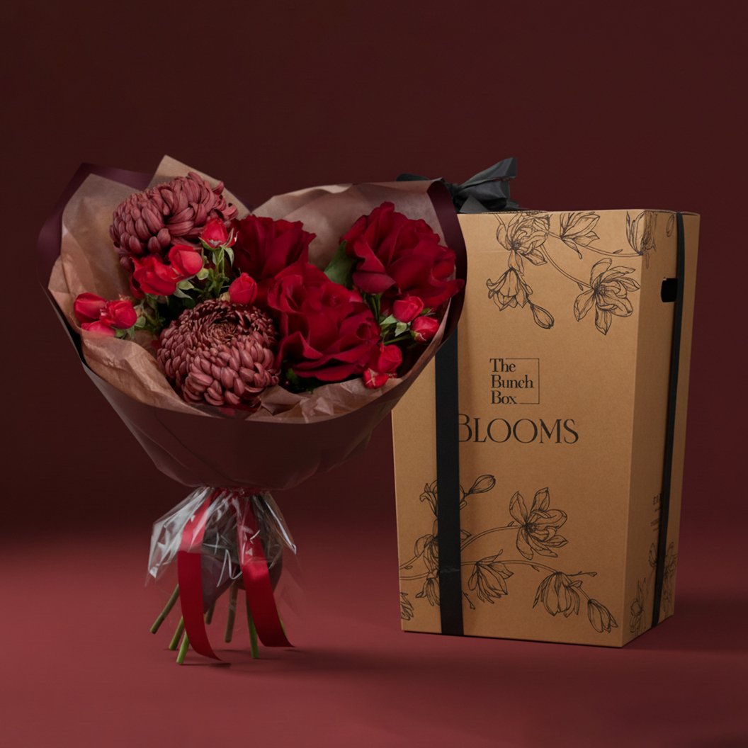 • Premium Finishing: Hand-tied with 2 layers of red satin ribbon and presented alongside The Bunch Box Blooms signature illustrated gift box for an elite unboxing.
