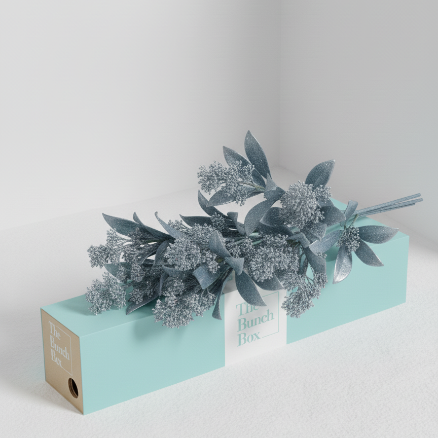 Skimmia Tinted Silver (1 Bunch): Premium Skimmia with dense clusters of buds, professionally tinted with a glacial silver finish.
