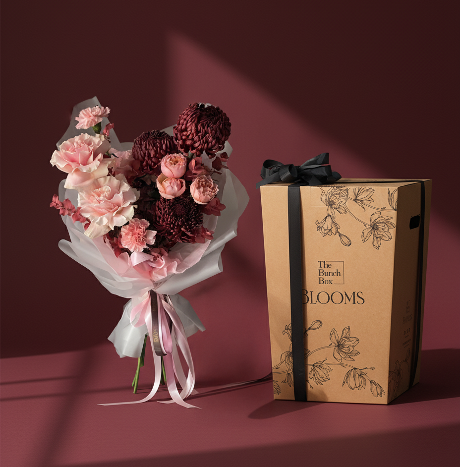 Luxury Unboxing: Arrives with a large “The Bunch Box Blooms” illustrated gift box featuring intricate floral line art and secured with a premium black satin ribbon.