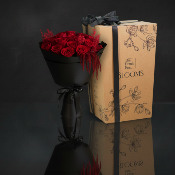 • Noir Designer Aesthetic: Expertly encased in 7 layers of sleek black structural wrapping, creating a sharp, modern contrast that allows the red blooms to pop.