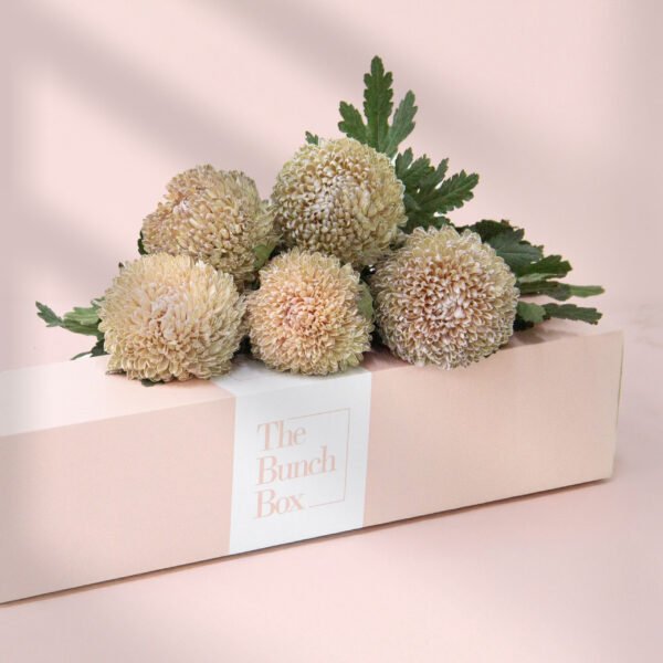 Introducing the Velvet Sand Blooms from The Bunch Box, a selection that captures the subtle beauty and warm tones of the Arabian desert. These exquisite blooms, likely featuring chrysanthemums with their intricate petal arrangements, showcase a unique blend of soft beige, sandy cream, and hints of muted blush. Each flower head features a densely packed, multi-layered petal structure, creating a velvety texture that is both visually appealing and subtly tactile.